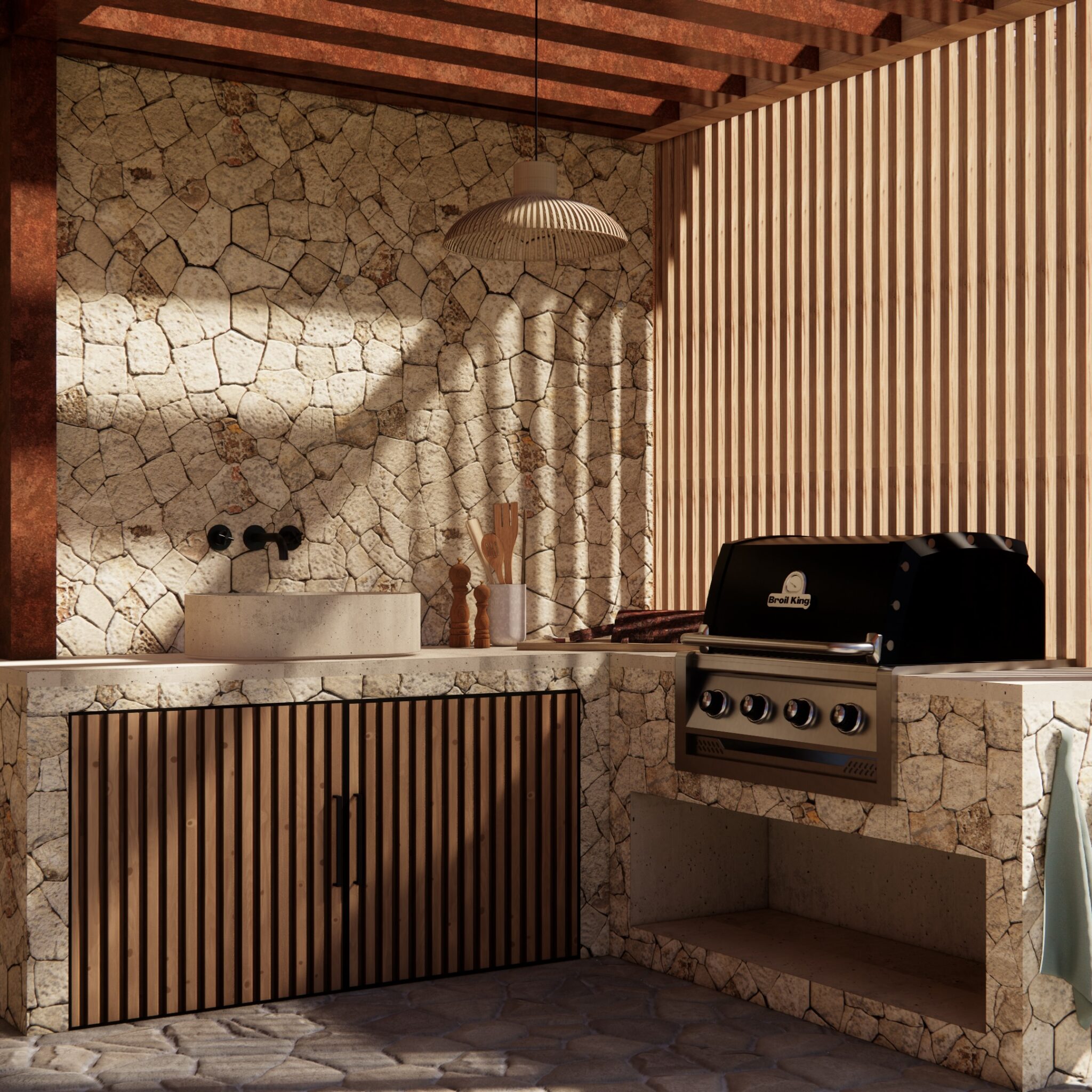 Structure en bois avec comptoir, pergola ajourée, coin salon abrité et brasero central : une terrasse conviviale pour des moments de bien-être et de partage.